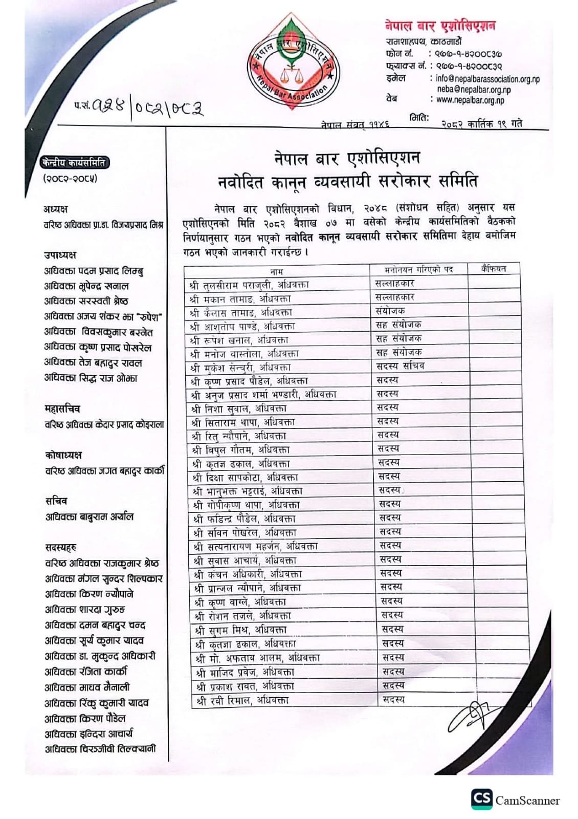 यस समितिमा अधिवक्ता श्री तुलसीराम पराजुली र अधिवक्ता श्री मकान तामाङलाई सल्लाहकार, अधिवक्ता श्री कैलास तामाङलाई संयोजक, अधिवक्ता श्री आशुतोष पाण्डेलाई सह–संयोजक, अधिवक्ता श्री रूपेश खनाल र अधिवक्ता श्री मनोज वास्तोलालाई सह–संयोजक तथा अधिवक्ता श्री मुकेश सेन्चुरीलाई सदस्य–सचिवका रूपमा मनोनीत गरिएको छ। साथै, अन्य २३७ जना अधिवक्ताहरूलाई पनि समितिको सदस्यका रूपमा मनोनीत गरिएको छ।
