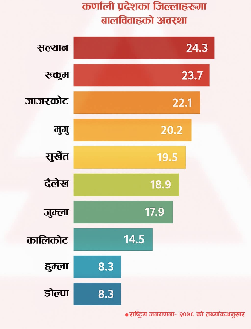यस्तै, दैलेख (१८.९%), जुम्ला (१७.९%), हुम्ला (१७.७%), कालिकोट (१४.५%), र डोल्पा (१३.८%) मा पनि सानै उमेरमा विवाह गर्ने परम्परा अझै बलियो छ।