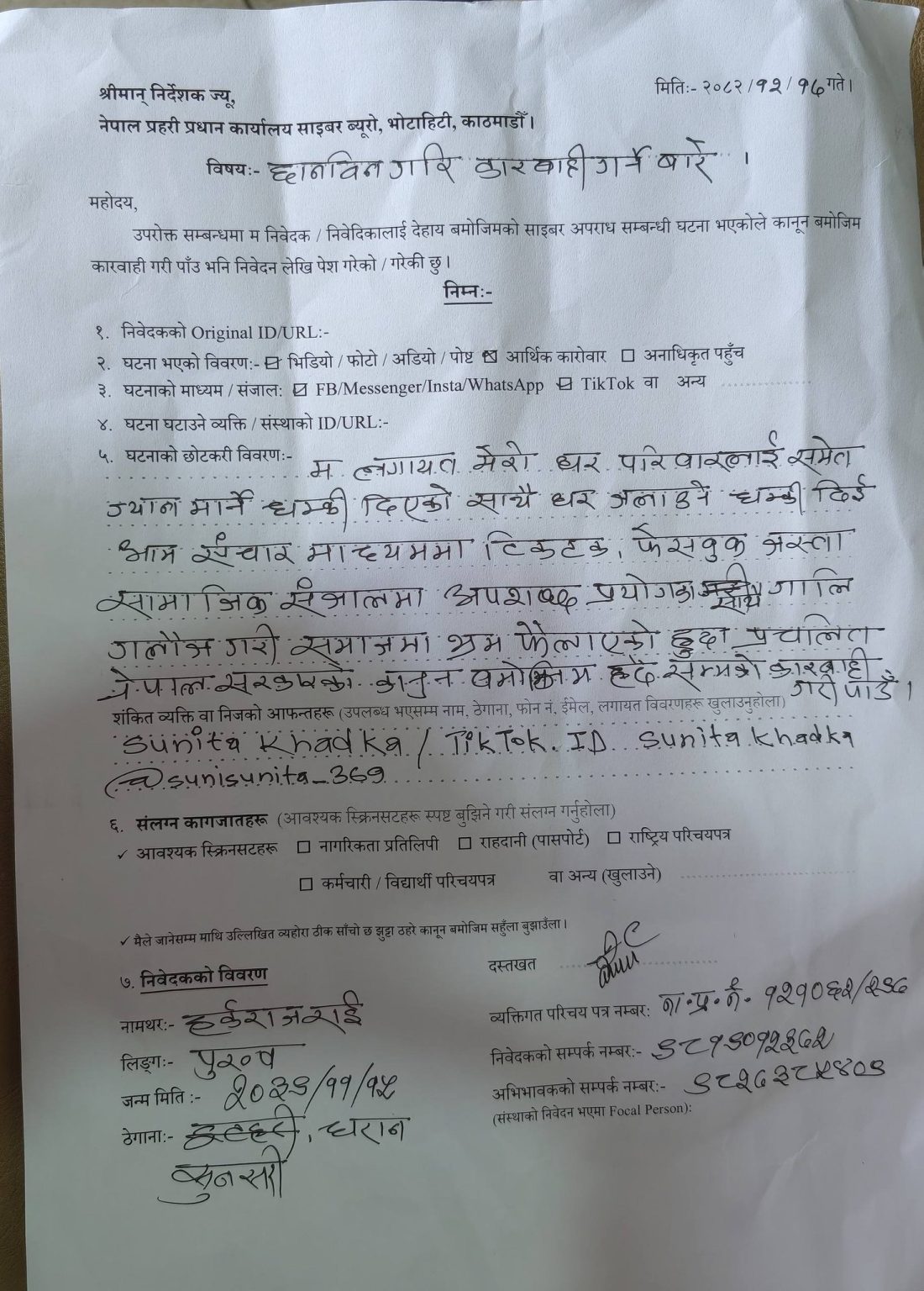 ‘टिकटकमार्फत ज्यान मार्ने र घर जलाउनेसम्मका धम्की दिँदै अत्यन्तै पाशविक शैलीमा गालीगलौज गरिएको छ,’ उजुरीमा उल्लेख गर्दै साम्पाङले यस्तो गतिविधिले सामाजिक सञ्जालको दुरुपयोग बढाएको समेत बताएका छन्।