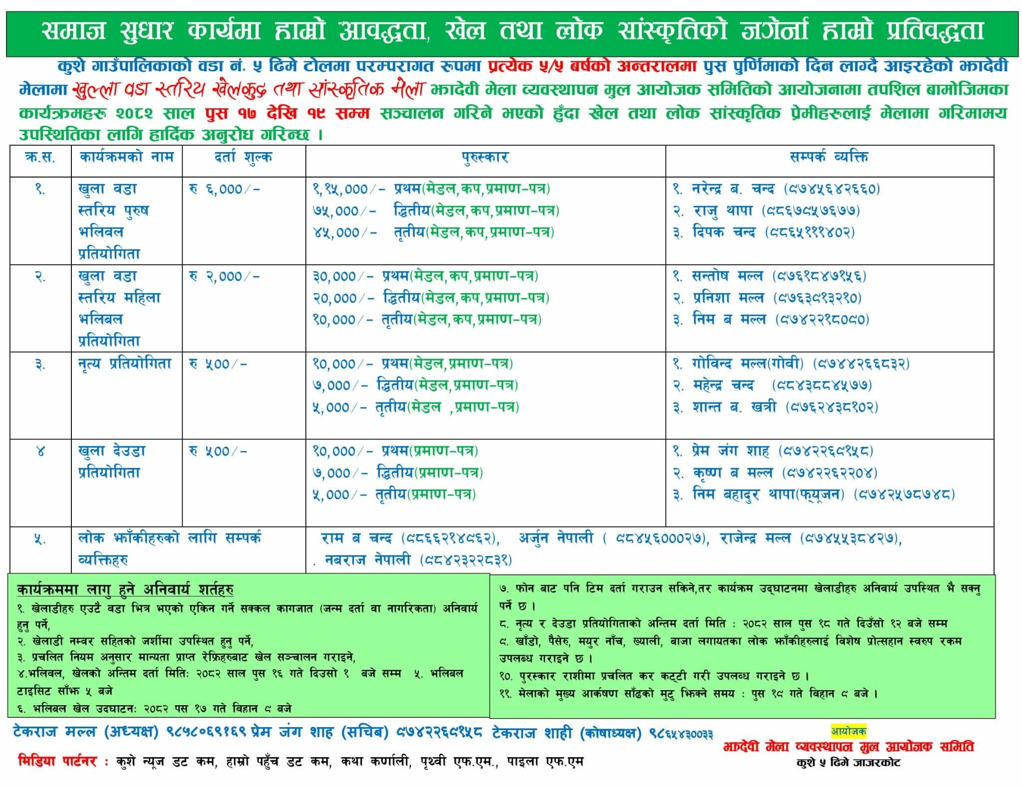मेलाको अवसरमा विभिन्न खेलकुद तथा सांस्कृतिक कार्यक्रमहरू आयोजना गरिने छन्।